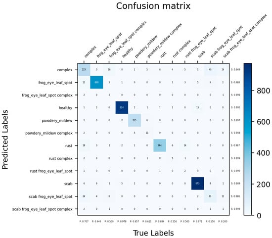 Figure 5 displays the confusion matrix findings that were obtained by applying our model to the FGVC8 dataset validation. Table 4 calculates the corresponding evaluation metrics. The confusion matrices and evaluation metrics for the other two datasets (PlantVillage and EMBRAPA) cannot be provided due to the vast number of categories in these datasets. The FGVC8 dataset, for example, shows that our proposed model has a reasonably good classification performance, and as can be seen in Figure 5, the classifications of Healthy, Rust, and Scab are very accurate. However, there are still some cases of misclassification. Through comparative observation, frog eye leaf spot is found to be more correctly classified, while other diseases are poorly classified. We found that the majority of the incorrectly categorized samples had comparable epigenetic characteristics, i.e., spots; second, there are many distinct disease kinds in the complicated category of leaf diseases, making it challenging to differentiate them from those in other categories because of their similarities. We discovered that the majority of the misclassified samples had comparable epigenetic characteristics, such as spots. These are really major obstacles that affect all models equally, not just those that we proposed.