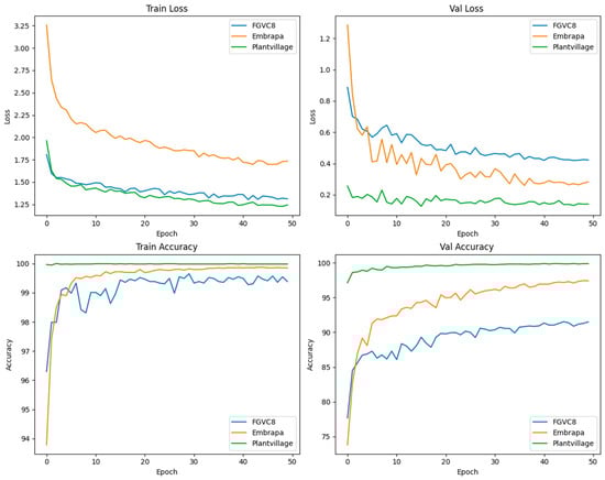 The model hyperparameters were adjusted slightly for each dataset, including learning rate, batch size, weight decay, and attention scaling. We utilized our pretrained models for transfer learning. For the PlantVillage dataset, we used a batch size of 64, a learning rate of 1 × 10−3, and attention scaling reduced by a factor of 4. For the FGVC8 dataset, the batch size was 128, with a learning rate of 5 × 10−4 and a four-fold reduction in attention scaling. For the EMBRAPA dataset, we used a batch size of 128, a learning rate of 1 × 10−3, and normal attention scaling. The weight decay was consistently set at 1 × 10−4, and the hidden dimension was 192.