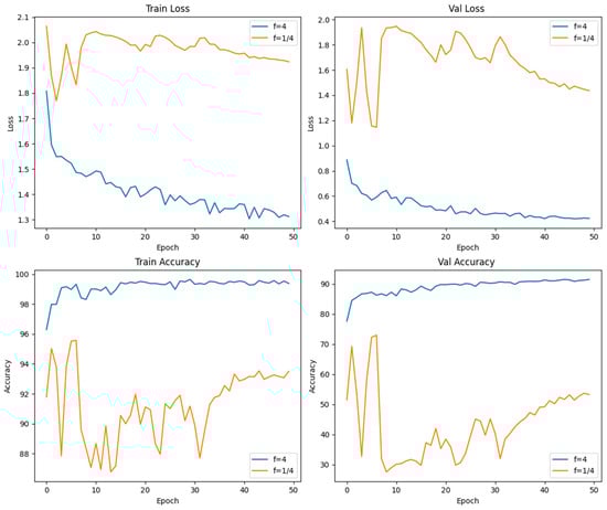The experimental results presented in Table 6 demonstrate that the size of the scaling factor () significantly influences the model’s performance. As the scaling factor varies, key metrics such as accuracy, validation loss, and precision exhibit fluctuations across different datasets.