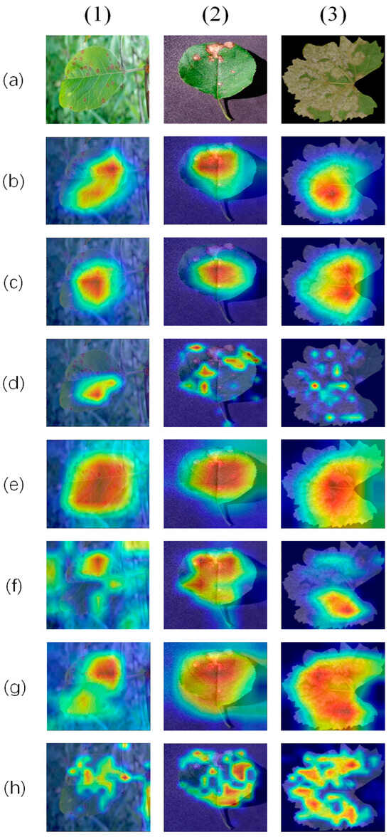 Grad-CAMs for (1) FGVC8, (2) PlantVillage, (3) EMBRAPA. (a) Val Images, (b) resnet18, (c) Resnet50, (d) ViT-S, (e) InceptionV3, (f) MobilenetV3, (g) SEnet, (h) Proposed.