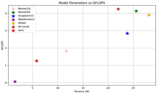 As shown in Figure 11, Grad-CAMs further illustrate these cases. Samples from each validation set of the three datasets were used. It is noteworthy that on the Plantvillage dataset, the other models correctly identified the full diseased leaf with a considerably greater accuracy rate; however, the ViT-S model could hardly identify the right disease area for any of the three datasets. In addition, the SEnet model and the InceptionV3 model could identify the diseased portion of the leaf in the EMBRAPA dataset very well. As shown in Figure 12, although the MobilenetV3 model recognition accuracy is not the best, its model parameters and GFLOPS are small enough. Upon comparing all of the models, it is evident that the proposed model is able to locate diseased plant leaf areas with clarity and progressively improve the capture of disease traits inside the targeted area. Meanwhile, we find that the proposed model can recognize plant leaf disease regions well both in the laboratory data background and in real scenarios, which further illustrates the feasibility of the model.