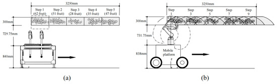 ![]() | Orchard | Apple | AP below 70% | 71.28%~80.45% | 5.8~6.7 s/fruit | Multi-arm harvesting robots combining sensing and task planning and control techniques | Positioning accuracy, operational efficiency, and collision risk | [12] |