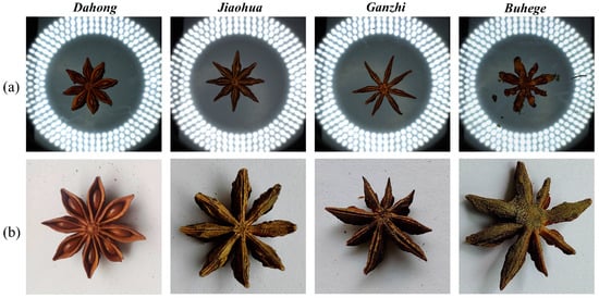 In this study, star anise of Funing County, Wenshan Prefecture, Yunnan Province, was selected as the research object. Under the guidance of agronomy experts and in strict accordance with the national standard (GB/T 7652—2016), careful selection was made to identify the Dahong, Jiaohua, and Ganzhi varieties, with additional Buhege samples collected. The different varieties of star anise are shown in Figure 1, including Dahong (plump fruit segments, brownish red color, the best quality), Jiaohua (reddish brown color, slightly lower quality), Ganzhi (often collected after falling, black red, poor quality), and Buhege (moldy, bad, or with broken and incomplete segments).