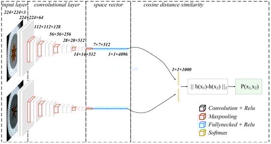 The Siamese Network is a neural network architecture consisting of two or more identical subnetworks with the same parameters and weights []. The parameters of the two VGG subnetworks are updated simultaneously through weight sharing, allowing the network to learn feature representations by comparing the similarity of input image pairs. The non-similar image filtering process is illustrated in Figure 4. In the input layer, images are resized to a fixed size. In the convolutional layer, image features are further abstracted and compressed, generating high-dimensional feature vectors. At the space vector stage, the output from the convolutional layer is transformed into spatial vectors via a fully connected layer. These vectors contain the critical feature information of the image and serve as the basis for similarity computation. Finally, in the cosine distance similarity stage, spatial vectors are compared using cosine similarity to calculate the similarity between two feature vectors. The two VGG networks independently extract image features and output feature vectors  and . The difference between these two feature vectors is then assessed by measuring the distance in the feature space. The similarity score  is the key metric used to determine whether the images are similar. The application of the Siamese Network ensures the scientific rigor of data filtering. The experiment set a similarity threshold of 0.9, and non-similar filtering was performed by measuring similarity, retaining samples with diversity and differences, forming a representative set of 1195 typical images.