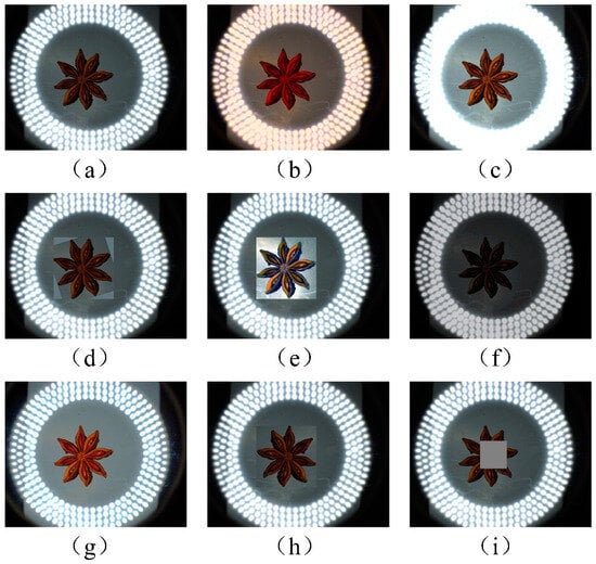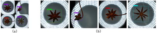 Due to the large number of images initially acquired, this study performed data selection on the image sets from each stage. A total of 18,000 images were selected from the turntable image set, high-resolution camera image set, and enhancement image set for training and testing the model in the experiments. Additionally, 1800 images were selected from an open-source dataset on the Roboflow website (https://universe.roboflow.com/hi-yuc6l/visual-inspection-of-star-anise/dataset, accessed on 3 June 2024) to serve as the evaluation set in the experiments. These selected datasets constitute the diversified fusion star anise image set in this study. To test the effectiveness and environmental adaptability of the object detection algorithm, the datasets were divided into training, validation, and test sets in an 8:1:1 ratio, with the open dataset serving as the evaluation set, as shown in Table 2.
