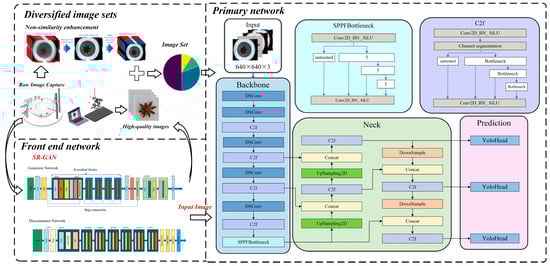 The overall architecture of the model is illustrated in Figure 8. The proposed cascade detection model consists of three main parts: the front-end SRGAN super-resolution generative adversarial network, diversified fusion image enhancement, and the improved primary YOLOv8 object recognition network. These components work together to complete the detection task.