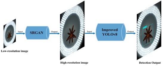 The collaborative detection process between the front-end network and the primary object recognition network is shown in Figure 9. This process begins by using SRGAN to reconstruct low-resolution images into high-resolution images to better capture the characteristic details of star anise in the images. The reconstructed images are then input into the improved YOLOv8 for detection.