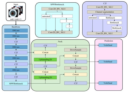 The YOLOv8 network structure [] comprises several components: the input layer, backbone network, enhanced feature extraction network, and head prediction network. In the backbone network, the C2f module replaces the C3 module, drawing on the ELAN concept from YOLOv7. The C2f module introduces additional parallel gradient flow branches to maintain a lightweight design while enriching gradient flow information, thus reducing computational load. Additionally, the increase in gradient flow also significantly enhances convergence speed and effectiveness. Furthermore, compared to the previous YOLOv5, the first convolution in the backbone has its kernel size reduced to 3. Specifically, the first convolution doubles the number of channels, and the resulting convolution is then split in half along the channels. It also incorporates the multi-stack structure from YOLOv7. In the enhanced feature extraction network, the feature layers obtained from the backbone network are no longer convolved, primarily to increase speed. Additionally, the preprocessing in the C2f module is changed from three convolutions to two convolutions. In the prediction head part, YOLOv8 uses a decouple-head structure. Specifically, a DFL (distance-based feature learning) module is added to the prediction head, enabling the probabilistic estimation of regression values. It optimizes the probabilities of the two positions closest to the target label using cross-entropy. This models the box position as a general distribution, enabling the network to quickly focus on the positional distribution near the target. The formula can be expressed as: