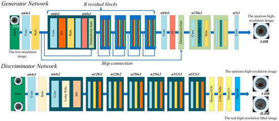 SRGAN utilizes perceptual loss and adversarial loss to enhance the realism of the reconstructed images. To ensure that the images generated by the generator are perceptually very close to real images, the perceptual loss is used as the loss function of the network, as shown in Formula (3). This loss function consists of content loss and adversarial loss.  represents the perceptual loss,  represents the content loss, and  represents the adversarial loss.