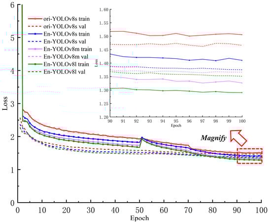As shown in Figure 14, the overall trend of the loss curves for different versions is similar. Zooming in on the curve region from the 90th to 100th epoch, the training and validation losses of Ori-YOLOv8s are higher than those of En-YOLOv8s, with more pronounced fluctuations. Additionally, the validation loss values for En-YOLOv8m and En-YOLOv8l are higher than their corresponding training loss values, indicating a potential risk of overfitting during the training process. This suggests that the m and l versions are less effective at learning from the dataset compared to the s version. Within the 90th to 100th epoch interval, the training loss of En-YOLOv8s is higher than the validation loss, with a lower final loss value and more stable overall performance. This indicates that the s version model has a stronger capability and a significant advantage in learning key information features from the images. It also demonstrates that the data enhancement strategy used in this study effectively improved the model’s generalization and robustness, contributing positively to enhancing network performance. Therefore, this study selected the YOLOv8s model, which is smaller in size and faster in detection speed, for further improvements and training.