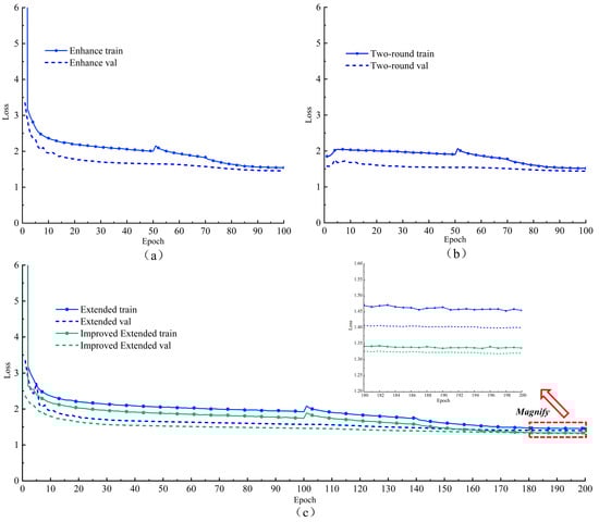 Loss curves for different optimization strategies: (a) Enhanced training; (b) Two-round training; (c) Extended training.