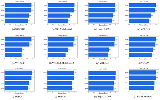 Based on the analysis of the above results, the lightweight improvements to YOLOv8s, the introduction of the front-end SRGAN, and the optimized training strategies all effectively enhance the model’s performance. The cascade network improves model accuracy while maintaining balanced speed, and with its smaller model size and faster inference speed, it offers feasibility for subsequent deployment. The mAP detection results of the various models in this experiment are shown in Figure 17.