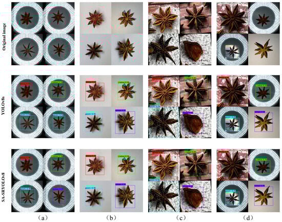 To validate the effectiveness of the proposed SA-SRYOLOv8 model for detecting star anise categories under different experimental conditions, an open dataset was used as the evaluation image set for assessing actual performance. Figure 18a shows the detection results on the turntable image set, Figure 18b on the high-resolution image set, Figure 18c on the open dataset, and Figure 18d on the diversified fusion image set. In terms of actual detection performance, the original YOLOv8s exhibited a misdetection in the Buhege category in Figure 18a, whereas the SA-SRYOLOv8 accurately identified the different star anise varieties with high confidence. This suggests that the network is more attentive to detailed features along the star anise edges and concave areas, while effectively filtering out irrelevant background information, as shown in Figure 18.