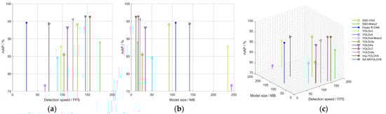 Comprehensive performance comparison chart of various detection networks: (a) mAP and real-time frame rate performance chart; (b) performance diagram of mAP and model size; (c) three-dimensional graphs of different network performances.