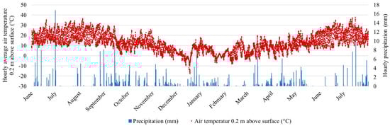 Hourly average air temperature (0.2 m above soil) and hourly precipitation (mm) at the site of the pot trial from June 2022 to July 2023. The watering events are not included.