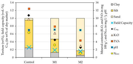 The sand content of the substrates thus varied as follows: 4.7 (control), 53.3 (M1), and 83.0wt% (M2). Figure 2 illustrates the share of sand, silt and clay, the field capacity, the contents of Corg, Nmin, P2O5, K2O, and the reactivity (pH) in each substrate variant. All soil analyses were carried out according to standard procedures of “Methods Book I” of the Association of German Agricultural Research and Research Institutes (VDLUFA) [49]. Then, five 6 L-standard pots were filled per variant with 6 kg of the respective substrate (Figure 3A,B).