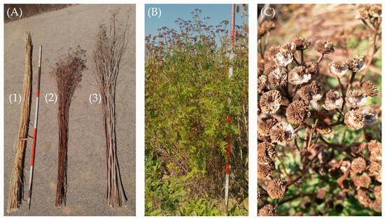 Impression of the common tansy plants that were available for seed collection at the Hohenheim site: The common tansy plants harvested in March 2022 (A2) in comparison with miscanthus (Miscanthus x giganteus Greef et Deuter, (A1)) and Virginia fanpetals (Sida hermaphrodita L. var. Rusby, (A3)), which are conventional bioenergy crops used for combustion; one of the common tansy plants in the field in late summer 2024 (B); an inflorescence of common tansy shortly after the seeds have fully ripened (C). The scale in (A,B) shows 50 cm intervals.