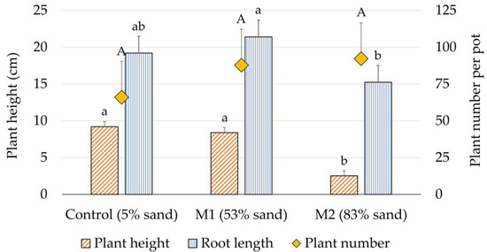 Results of the statistical analyses of the effects of the substrate (control, M1, and M2) on average plant height, average root length, and average plant density (plant number pot−1). The positive error bars show the standard errors, different letters denote significant (p < 0.05) differences between the substrates within each trait (plant height, root length, and plant number, respectively).