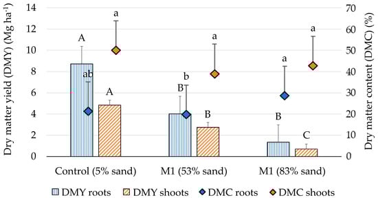 Results obtained from the statistical analyses of the effects of the substrate (control, M1, and M2) on the dry matter yield (bars) and dry matter content (marks) in the belowground (“roots”) and aboveground (“shoots”) parts of common tansy. The positive error bars show the standard errors, different letters per parameter per planting fraction show significant differences (p < 0.05).