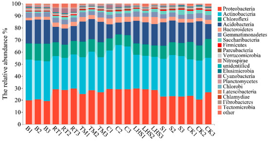 Under different straw-returning methods, the composition of the soil bacteria at the phylum level remained consistent, with no specific bacterial phyla detected. In total, 11 bacterial phyla with relative abundances more significant than 1% and 19 bacterial genera with relative abundances more significant than 1% (including other genera and unidentified genera) were detected in the soil samples of the seven treatments. As shown in Figure 1, after various straw-returning treatments, Actinobacteria, Proteobacteria, and Acidobacteria exhibited higher relative abundances than the other phyla, making them the dominant phyla, accounting for 27.42–34.71%, 20.05–29.07%, and 10.82–19.71%, respectively. The relative abundance of Actinobacteria increased in all straw-returning treatments compared with CK, particularly in the C treatment, and showed a significant increase of 14.49%. Proteobacteria increased in all straw-returning treatments, except B and S treatments, with a substantial increase of 23.72% in the C treatment. Acidobacteria increased in all treatments, except RT and C treatments, with a significant increase of 22.04% in the B treatment.