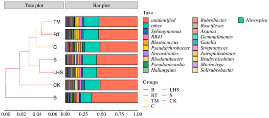 As shown in Figure 2, at the genus level, the unidentified genera exhibited the highest relative abundance, ranging from 51.88% to 63.26%. Following closely was the relative abundance of the others. Furthermore, the top three dominant genera in terms of relative abundance were Sphingomonas, RB41, and Blastococcus, with relative abundances ranging from 1.70% to 4.69%, 1.88% to 3.71%, and 0.97% to 3.31%, respectively. As depicted in the graph, after the straw returning, the relative abundance of Sphingomonas significantly decreased compared with CK, particularly for treatment B, exhibiting a reduction of 63.84%. Conversely, the relative abundance of RB41 increased in all treatments, with treatment B showing a significant rise of 97.68% compared with CK. Similarly, Blastococcus demonstrated an overall increase in relative abundance, with treatment C showing a substantial rise of 241.02% compared with CK. Pseudarthrobacter exhibited a relative abundance in all treatments, with treatments TM and C increasing by 343.30% and 327.03%, respectively. Nocardioides also showed a consistent increase, particularly in treatment C, which increased by 77.79%. On the other hand, the relative abundance of Rhodanobacter decreased in all treatments, with treatment B showing the most significant reduction of 91.51%. Haliangium showed a decreasing trend in relative abundance in all treatments except for RT, with treatment B exhibiting a substantial decrease of 41.05%. Gemmatimonas displayed a significant decline in relative abundance compared with CK, with treatments B and C showing reductions of 71.15% and 62.61%, respectively. Gaiella demonstrated increased relative abundance in all treatments except for treatment C, and treatment B exhibited a significant increase of 67.44%. All treatments of Streptomyces showed a decrease, with treatment B decreasing by 42.01% and treatment C decreasing by 40.78%. Microvirga exhibited an overall increase in relative abundance in all treatments, with treatment C showing a significant increase of 355.08%.