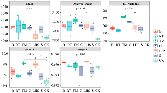 Alpha analysis of soil bacteria using various returning techniques. * indicates the least significant difference at p < 0.05; ** indicates the least significant difference at p < 0.01.