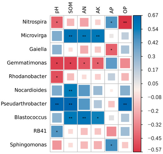 To further analyze the impact of soil microorganisms on soil nutrients, we conducted a correlation analysis of the bacterial genera with a relative abundance greater than 1% and the chemical properties. Detailed information is presented in Figure 4. The results indicated that the pH was significantly negatively correlated with Nitrospira (p = 0.048), Gemmatimonas (p = 0.012), and Rhodanobacter (p = 0.025), but significantly positively correlated with Pseudarthrobacter (p = 0.001) and RB41 (p = 0.047). SOM was significantly negatively correlated with Gemmatimonas (p = 0.013), but significantly positively correlated with Microvirga (p = 0.004), Nocardioides (p = 0.008), Pseudarthrobacter (p = 0.001), and Blastococcus (p = 0.007). AN was significantly negatively correlated with Gemmatimonas (p = 0.033), but significantly positively correlated with Microvirga (p = 0.007) and Blastococcus (p = 0.004). AK was significantly negatively correlated with Gemmatimonas (p = 0.049), but significantly positively correlated with Microvirga (p = 0.006) and Blastococcus (p = 0.013). AP was significantly positively correlated with Nitrospira (p = 0.046) and Sphingomonas (p = 0.032), but significantly negatively correlated with Gaiella (p = 0.048). OP was significantly negatively correlated with Nitrospira (p = 0.007), but significantly positively correlated with Pseudarthrobacter (p = 0.001).