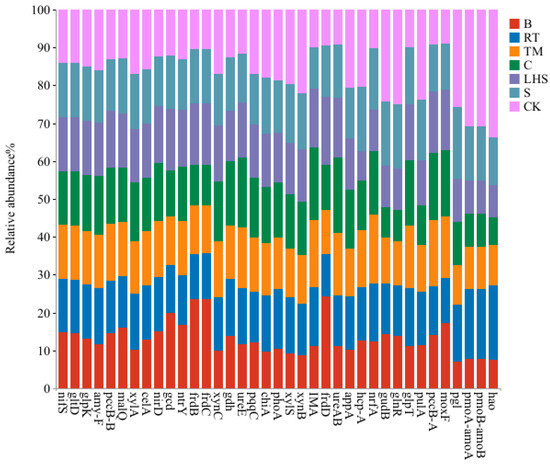 Relative abundance of distinct gene compositions related to carbon, nitrogen, and phosphorus cycles in soils treated differently.