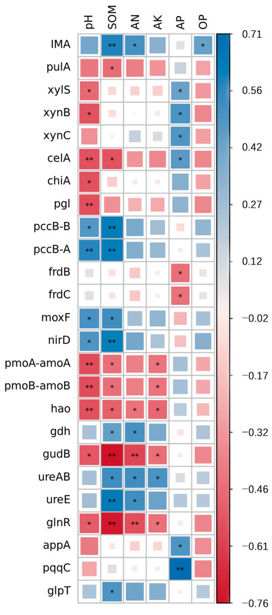 Correlation heat map of distinct genes and chemical characteristics of soils after several treatments. Blue represents a positive correlation, red represents a negative correlation, and the color shade indicates the strength of the correlation. * p < 0.05; ** p < 0.01.