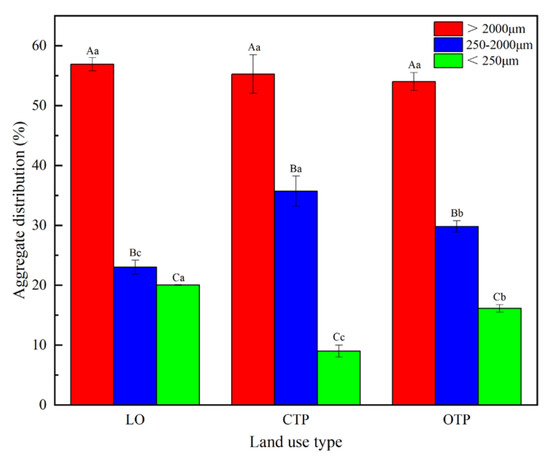 Distribution of particle sizes in soil aggregates for soils from the various land use types and management practices. LO: longan orchard; CTP: conventional tea plantation; OTP: organic tea plantation. Different uppercase letters indicate significant differences in aggregate size class within the same treatment (p < 0.05), and different lowercase letters indicate significant differences between treatments within the same aggregate size class (p < 0.05).