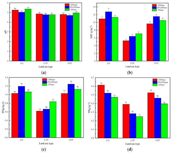 Soil pH (a), contents of SOC (b), TN (c), and TP (d) within the particle-size fractions under longan orchard (LO), conventional tea plantation (CTP), and organic tea plantation (OTP). Error bars indicate the standard error (±) of the treatment mean (n = 4). Different uppercase letters indicate significant differences in aggregate size class within the same treatment (p < 0.05) and different lowercase letters indicate significant differences between treatments within the same aggregate size class (p < 0.05).