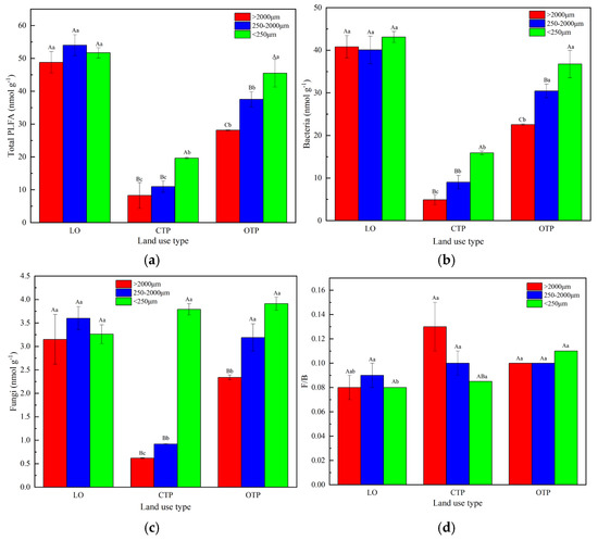 As shown in Figure 3, both CTP and OTP significantly altered the total microbial biomass estimated from total PLFA as well as the biomass of bacteria and fungi within aggregate particles (p < 0.05). Except for the fungi biomass of micro-aggregates, which did not differ significantly from that in LO, the total and bacteria biomass within aggregate fractions tended to decrease significantly in CTP. The reduction in bacteria and fungi biomass in OTP was less than in CTP, especially within micro-aggregates. In addition, both CTP and OTP increased the F/B. The distribution of the total microbial, bacteria, and fungi biomass within aggregate fractions was similar for CTP and OTP, with significantly higher biomass in micro-aggregates than large macro-aggregates, with macro-aggregates being intermediate in value (p < 0.05, Figure 3a–c). Moreover, ANOSIM results showed that the microbial community structure was significantly altered among the three land use types within large macro-aggregates and macro-aggregates (Table S2). However, no remarkable differences in microbial community structure were observed within micro-aggregates.