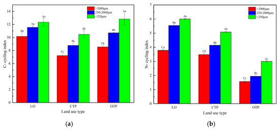 Interestingly, we found that the distribution patterns of C-, N-, and P-cycling indices were not significantly influenced by land conversion. A possible explanation is that aggregate size, with its diverse physiochemical and biological properties, plays a more substantial role in affecting enzyme activities than the land use type or management regime [63].