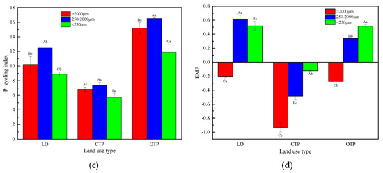 Soil aggregates related C- (a), N- (b), P- (c) cycling indices and ecosystem multifunctionality (EMF) (d) across the three land use types. Error bars indicate the standard error (±) of the treatment mean (n = 4). LO: longan orchard; CTP: conventional tea plantation; OTP: organic tea plantation. Error bars indicate the standard error (±) of the treatment mean (n = 4). Different uppercase letters indicate significant differences in aggregate size class within the same treatment (p < 0.05), and different lowercase letters indicate significant differences between treatments within the same aggregate size class (p < 0.05).