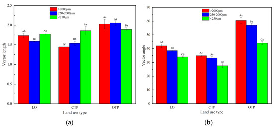 Vector characteristics of extracellular enzyme stoichiometries within soil aggregates across different land use types. (a) Vector length, (b) vector angle. Error bars indicate the standard error (±) of the treatment mean (n = 4). Overall treatment differences are noted on the graphs. LO: longan orchard, CTP: conventional tea plantation, OTP: organic tea plantation. Different uppercase letters indicate significant differences in aggregate size class within the same treatment (p < 0.05) and different lowercase letters indicate significant differences between treatments within the same aggregate size class (p < 0.05).