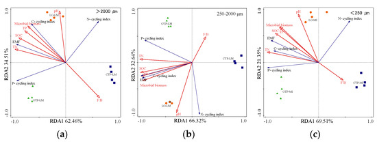 Redundancy analysis (RDA) to identify the relationships between soil physiochemical properties, microbial community, individual nutrient cycling indices, and EMF. (a) Within the large macro-aggregates, (b) within the macro-aggregates, (c) within the micro–aggregates. SOC: organic carbon, TN: total nitrogen, TP: total phosphorus.