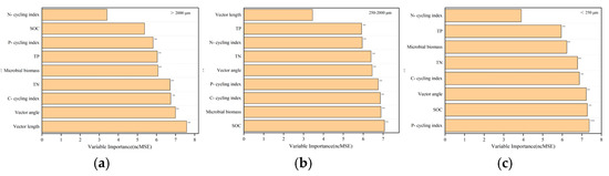 To quantitatively evaluate the relative contributions of soil physiochemical properties and microbial community to EMF, we employed a random forest model. In large macro-aggregates, vector length, vector angle, and C-cycling indices were the main drivers for EMF (Figure 7a). In macro-aggregates, SOC, microbial biomass, and C-cycling indices were the main contributors to EMF (Figure 7b). In micro-aggregates, P-cycling indices, SOC, and vector angel were the key drivers of EMF (Figure 7c).