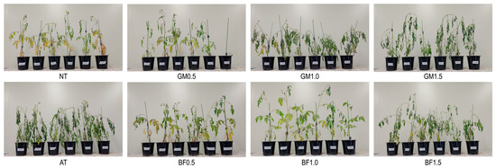 Plant phenotypes for each treatment stressed by water shortage for 2 weeks. BF, biofumigated soil; GM, green manure soil treatment; AT, autoclaved soil treatment; NT, non-treated soil treatment.