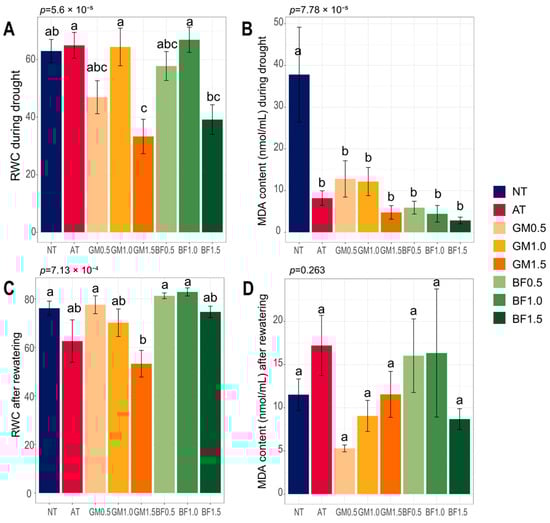 Plant stress markers for each treatment. RWC (A,C) and MDA content (B,D), during drought and after rewatering. BF, biofumigated soil; GM, green manure soil treatment; AT, autoclaved soil treatment; NT, non-treated soil treatment. Each color indicates its group as described in the legend on the right side of the barplot. Significance was tested using ANOVA and the p values are above the bars. Letters above the boxes indicate the difference calculated by Bonferroni’s method in which the p value is <0.05. Error bars indicate the standard errors.