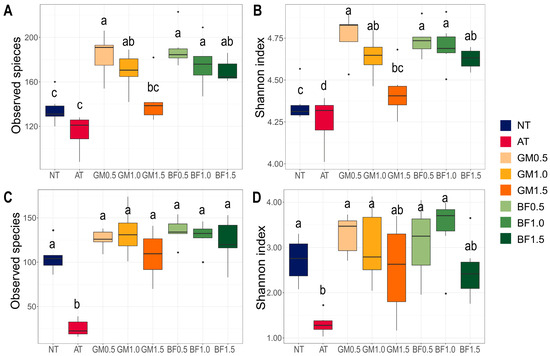 We calculated two indices of alpha diversity: the Shannon index and observed species. In bacterial communities, both indices increased in all biomass treatments (BFs and GMs) compared to the non-treatment. At the same time, they displayed a concentration-dependent decrease, with GM1.5 being the lowest. Autoclaving lowered both diversities (Figure 3A,B). GM1.5 had also the lowest values among the biomass treatments in mycobiota. AT had a minimum for both indices of mycobiota (Figure 3C,D).