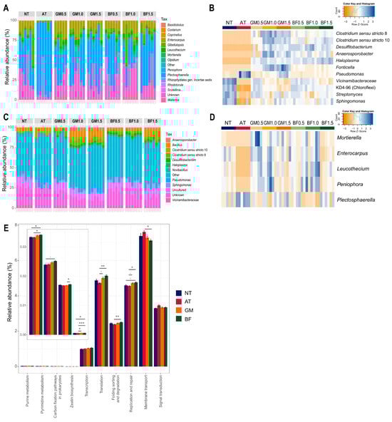 Differences of microbial structures following each treatment. Microbial composition of bacterial (A) and fungal (C) community, relative abundance of differentially abundant genera (B,D), and predicted functional genes (E). BF, biofumigated soil; GM, green manure soil treatment; AT, autoclaved soil treatment; NT, non-treated soil treatment. Each color in the composition plot represents one of the top 15 taxa on the right side. The heatmaps include samples as columns and selected genera as rows. The blue color indicates higher abundance and an orange color indicates lower abundance. Star marks in the barplot refer to significance calculated by Bonferroni’s method; . p < 0.1, * p < 0.05, ** p < 0.01, *** p < 0.001.