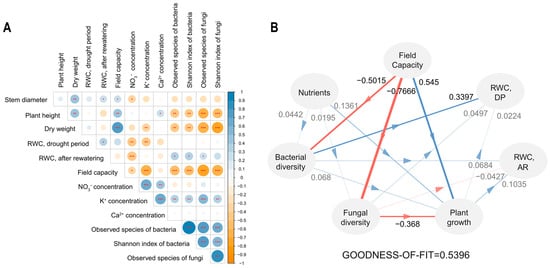 Relationships between components of the microbiome. The correlation plot (A) indicates positive with blue and negative with orange. Star marks refer to significance calculated by the Pearson’s correlation coefficient; * p < 0.05, ** p < 0.01, *** p < 0.001. The partial least squares path modeling (PLS-PM; (B)) contains paths that mean a positive effect with blue and a negative effect with red. DP and AR refer to the drought period and after rewatering, respectively. Nutrients and plant growth are represented by the K+ concentration and dry weight. Path coefficients are marked above each path along with the weighted paths. The goodness-of-fit test confirms this model with a high value of >0.5.