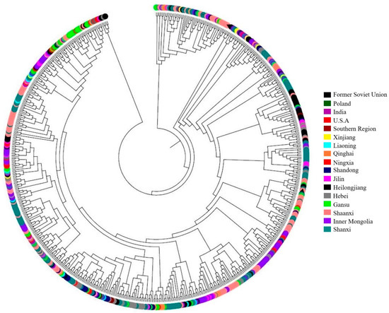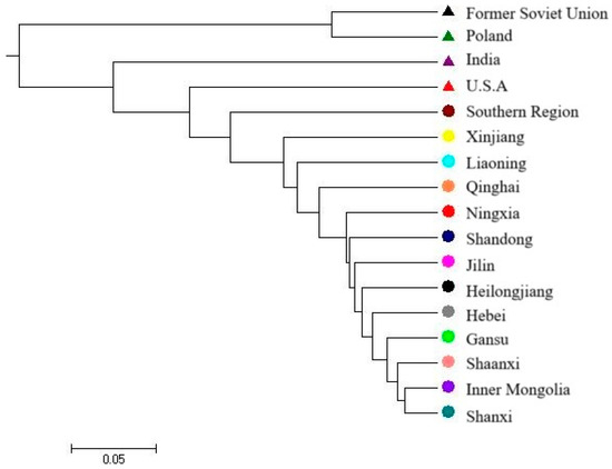 Genetic similarity and genetic distance were calculated to further elucidate the genetic relationships among accessions (Table 5). The average genetic similarity and average genetic distance among the 17 populations were 0.822 and 0.214, with ranges of 0.379–0.975 and 0.025–0.970, respectively. The greatest genetic distance was observed between the South region and Poland, followed by the distance between the South region and the Soviet Union. The smallest genetic distance was observed between Gansu and Ningxia and revealed the closest genetic relationship of accessions from the two provinces. The majority of genetic distance between domestic populations was less than 0.1 (except for values between the South region and other provinces, and the values between Xinjiang and Liaoning, Ningxia, Gansu, Qinghai, and Shandong, as well as values between Heilongjiang and Liaoning and Ningxia). In contrast, the genetic distance between domestic and foreign populations was dramatically higher, some of which are even as high as 0.6778 (between Heilongjiang and Poland). These results showed that much greater genetic distances existed between domestic and foreign populations than among domestic populations.