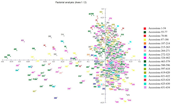 The factorial correspondence analysis (FCA) and its pattern of spatial distribution of genetic variability among 634 accessions of broomcorn millet core collection.