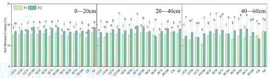 Characteristics of the changes in mean soil water content in a vertical direction under different organic–inorganic fertilizer ratios and organic fertilizer types in 2022 (based on the Analysis of Variance (ANOVA) with Standard Error (SE), where, if the letters above two bars are different, it indicates that there is a statistically significant difference between the means of the two groups; if the letters are the same, then it indicates that there was no statistically significant difference between the means of the two groups). These letters are the results based on a specific statistical test (Least Significant Difference, LSD).