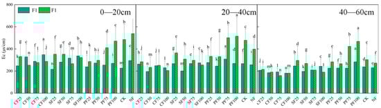 The average soil moisture content and EC of the soil layers during the crop growth period were calculated. The results are shown in Figure 1 and Figure 2. The application of organic fertilizers was observed to increase the soil moisture content in the 0–20 cm layer while reducing it in the 20–60 cm layers. Compared to conventional fertilization practices, the application of organic fertilizers primarily led to a decrease in the soil moisture content in the 0–40 cm soil layer. Additionally, the application of organic fertilizers was found to reduce the soil EC values. Compared to the conventional fertilization treatment, CF50, SF50, and PF50 reduced the soil salinity by 9.6, 13.5, and 5.1%, respectively, in the 0–60 cm layer of F1, as well as by 44, 23.3, and 26.2%, respectively, in F2.
