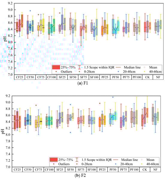 The characteristics of the pH changes in the F1 to F2 agricultural soils under different types of organic fertilizers and ratios in 2022.