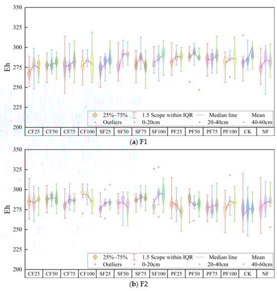 Two-way ANOVA and repeated measures ANOVA were used, as shown in Table 3 and Table 4. Compared with conventional fertilization, the application of the organic fertilizer reduced the soil pH in F2, with the order of different organic fertilizer types being PF > SF > CF > NF. By analyzing the marginal mean values of the three soil layers monitored at different time points during the growth period, it was found that, in F1, the order was 25 > 50 > 75 = 100%, and the order of the different organic fertilizer types was NF > CF > SF > PF. In F2, the order was 50 > 25 > 100 > 75%, with the order of organic fertilizer types being NF > PF > SF > CF. The application of organic fertilizer to replace part of the inorganic fertilizer under N reduction reduced the soil pH and prevented excessive soil alkalization. In F1, the order of the different organic fertilizer types in terms of the soil Eh value was PF > SF > CF > CF. Compared to conventional fertilization, the application of PF and SF increased the soil Eh by 2 and 0.8%, respectively, while the CF decreased it by 1%. In F2, the order was CF > SF > CF > PF. The application of CF and SF increased the soil Eh by 1.9 and 1.3%, respectively, whereas the application of PF decreased it by 0.6%. The redox properties of the soil treated with different types of organic fertilizers were significantly affected by the initial salt content, leading to different soil Eh values.