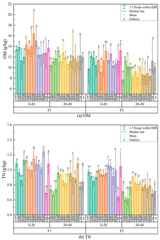 The soil OM and TN under different types of organic fertilizers and ratios in 2022 (these differences analyzed in the figure were specific to the comparisons between different treatments applied to the same soil type and soil layer). These letters were derived from the results of a specific statistical test known as the Least Significant Difference (LSD) test).