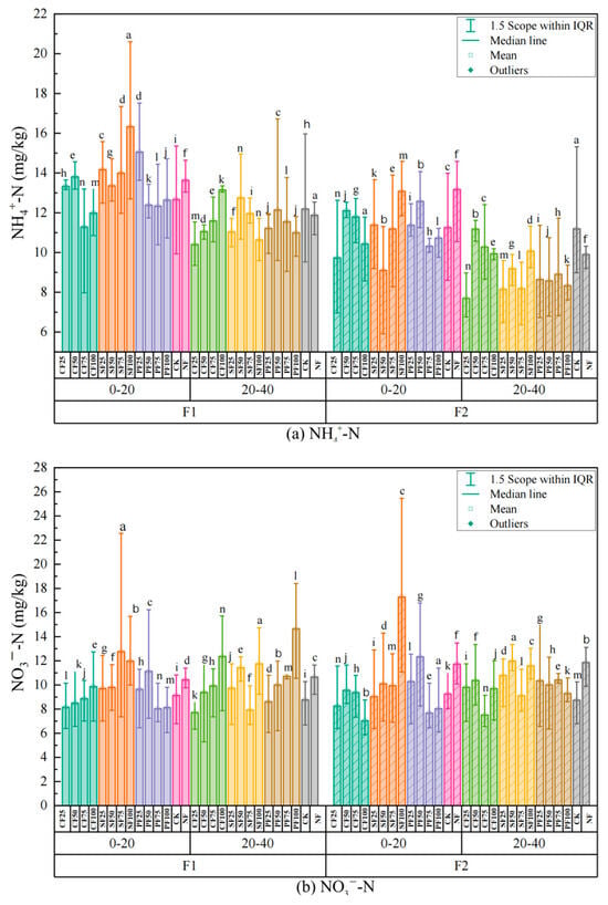 The NH4+-N and NO3−-N content of the 0–20 and 20–40 cm soil under different types of organic fertilizers and ratios in 2022 (the analysis of differences shown in the figure was conducted to compare the various treatments within the same soil type and soil layer). These letters were derived from the results of a specific statistical test known as the Least Significant Difference (LSD) test.